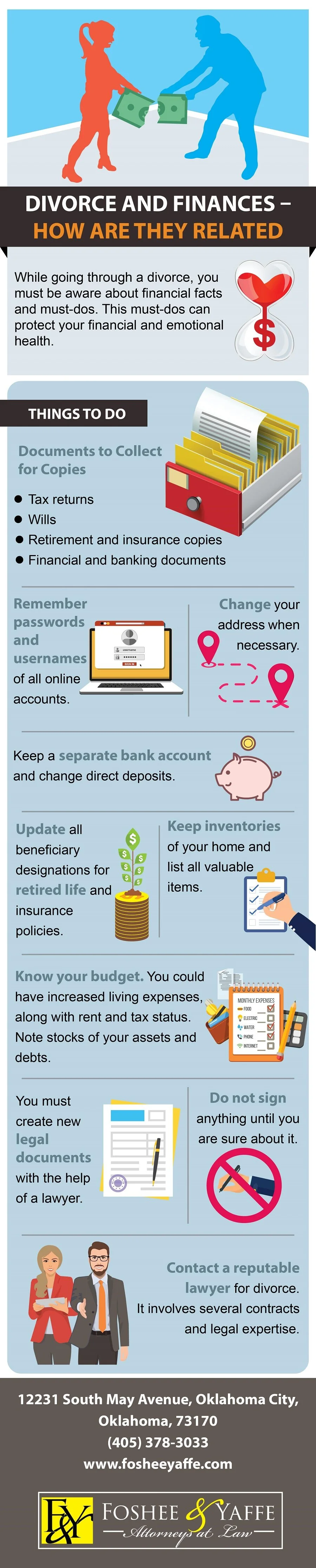 What comes obviously with a divorce is finance. When you are going through a divorce you must keep all documents in a right manner along with insurance copies tax returns and obviously separate bank accounts. Finally, you should hire a good divorce lawyer in OKC. See this infographic to learn more about divorce and finance during that period.